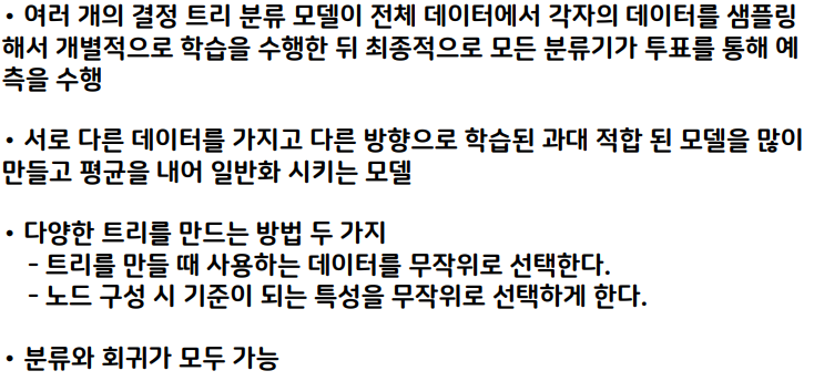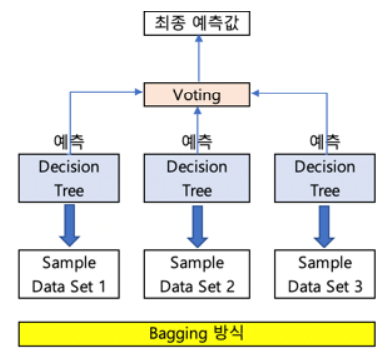 Bagging 방법 중 하나 의 예로 랜덤 포레스트라는 방법이 있다.