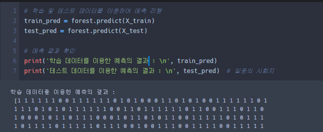 - 위에서 생성한 랜덤포레스트 모델에 학습 및 테스트 데이터를 넣고 예측값을 구한다 .