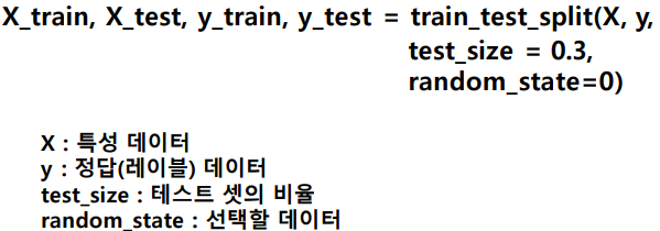 - "random_state" => 선택할 데이터가 섞이지 않도록 해준다. 반복되는 학습 속에서 30%라는 테스트 데이터의 비율은 지켜지겠지만. 그 안의 값들은 달라질 수 있다. 즉, 반복해서 데이터를 골랐을 때 같은 데이터를 뽑을 수 있게 해준다.