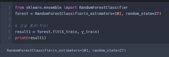 - 랜덤 포레스트 모델 생성을 위한 "RandomForestClassifier" 호출