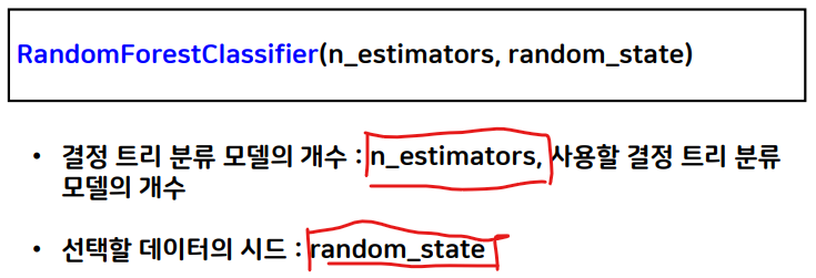 - 위에서 언급했든 "n_estimators"는 사용할 결정 트리 분류 모델의 개수 이며, "random_state"는 선택할 데이터의 시드 이다.