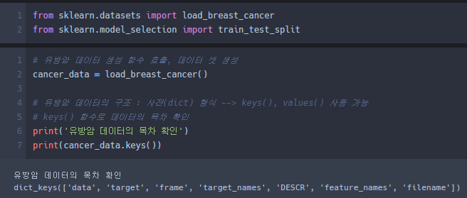 - "sklearn.datasets"에서 실습할 유방암 데이터를 호출 -> "load_breast_cancer".