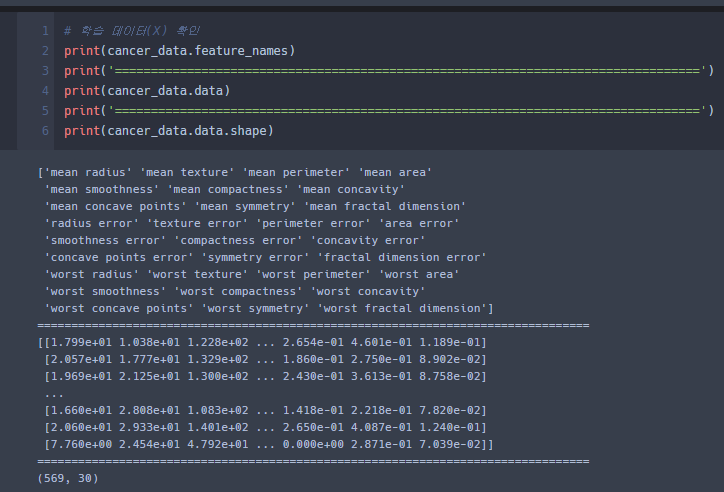 - shape 를 통해 데이터는 총 569개이며 각 항목은 30개임을 알 수 있다.
