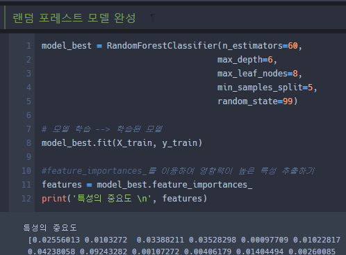 - 위에서 찾은 조합을 참고하여, 랜덤 포레스트의 최적 조합 모델 을 "model_best"에 담았다.