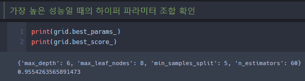 - "grid"로 찾은 최적의 조합을 best_params_ 명령어로 찾는다.