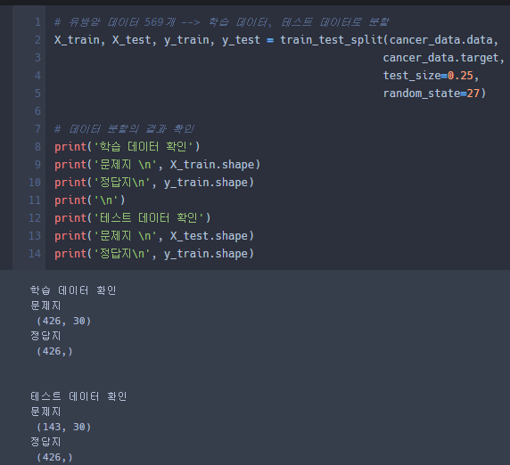 - train 및 test 데이터 생성, 학습에 data를 테스트(정답)에 target을 준다.