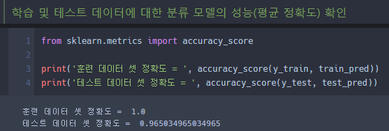 - "accuracy_score"를 통해 생성한 모델에 학습 및 테스트 데이터로 성능을 구한다.