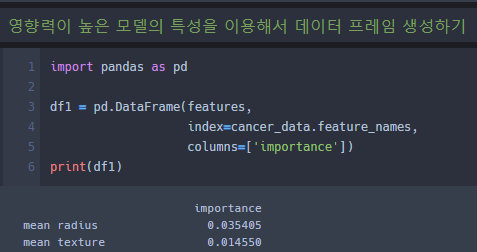 - "pandas" Library로 DataFrame을 생성, Data는 중요도를 담은 "features" , index는 항목의 이름 을 준다.
