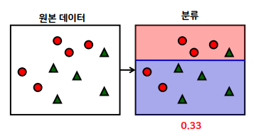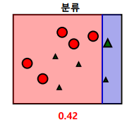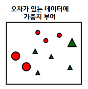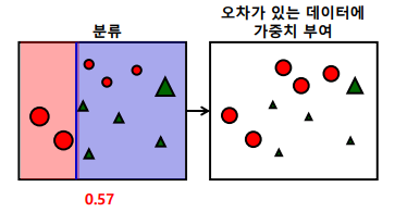 - 잘못된 3개의 빨간 원에 높은 가중치를 부여하고 맞은 5개의 녹색 세모는 낮은 가중치를 부여