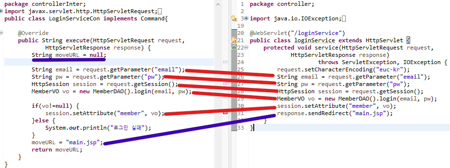 - 해당 코드는 Login 기능을 담당하는 로그인 파일로 "loginServiceCon.do"라는 경로 인식시 이동하는 파일이다.
