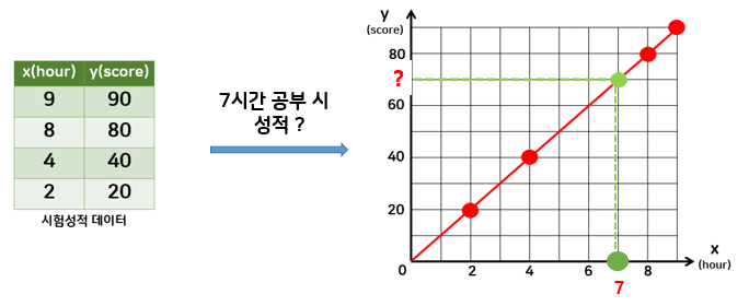 위의 예시에 나온 "시험 성적"이란 데이터를 < y = ax + b >의 형태로 예측 가능하다는 것이다.