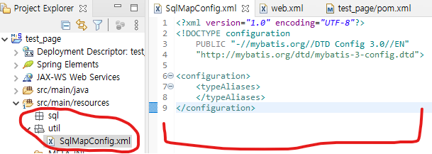- util 아래에는 SqlMapConfig.xml 파일을 생성하는데, 해당 파일은 dto 같은 파일들의 이름이 길기 때문에 별칭을 주어 사용하기 위함이라고 한다. 해당 파일은 아래의 코드를 주면 됨.