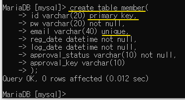 - reg와 log는 각각 가입, 로그인 일자를 말하며, approval_status는 이메일의 인증 여부, approval_key는 이메일에 발송할 key를 의미한다.