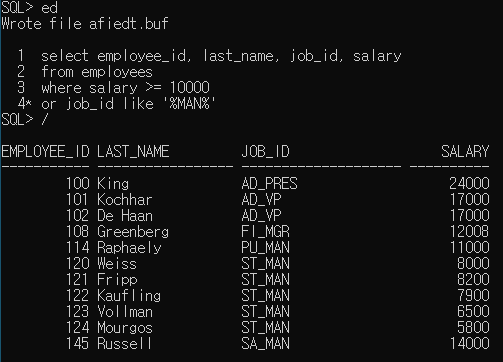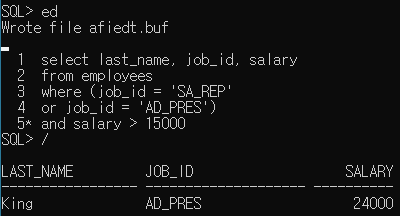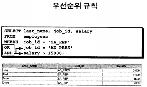 'JOB_ID'가 'SA_REP' 혹은 'AD_PRES' 인 사람 중에서 봉급이 15000 보다 많은 사람을 걸러 출력시킬 수 있다.
