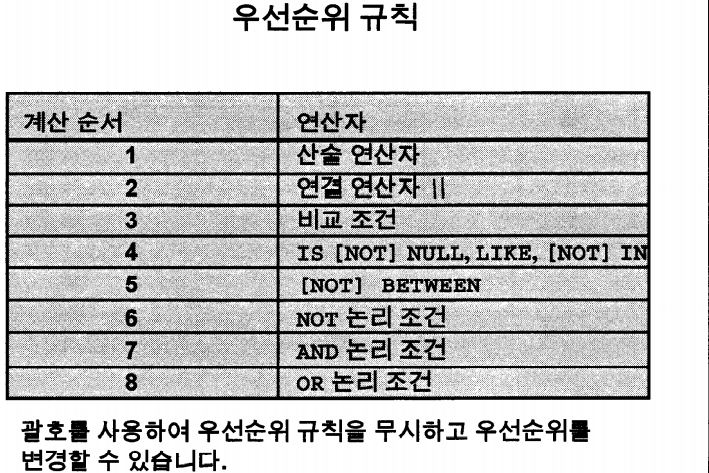 'NOT' 연산자의 경우 위 그림처럼 사용한다. 사용할 때에는 5일차에 배웠던 '다른비교조건'의 4가지 구문과 함께 사용한다. (한가지 주의는 'IS NULL'의 경우 NOT이 앞에 붙지 않고 중간에 붙는다.)