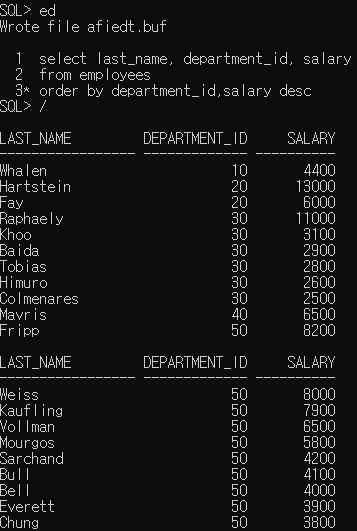 멀티플 정렬, 그니까 ORDER BY절로 2개를 내림차순 정렬하면 일단, department_id를 기준으로 먼저 내림차순 정렬이 되고 해당 정렬 기준으로 그룹화하여 그 안에서 salary를 내림차순 정렬한다.