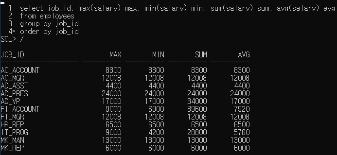 19. 각 직업별 최대급여, 최소급여, 급여 총 합 및 평균 급여를 출력하시오. 단, 최대 급여는 MAX, 최소 급여는 MIN, 급여 총 합은 SUM 및 평균 급여는 AVG로 출력하고, 직업을 오름차순으로 정렬하시오.