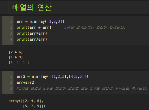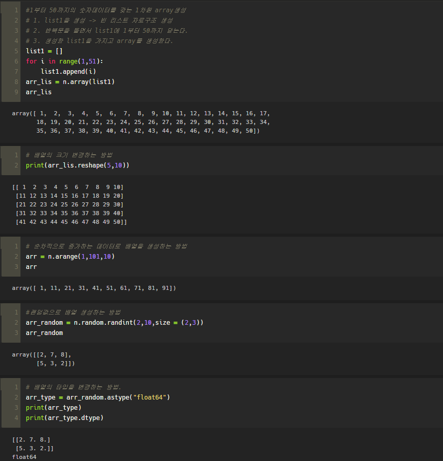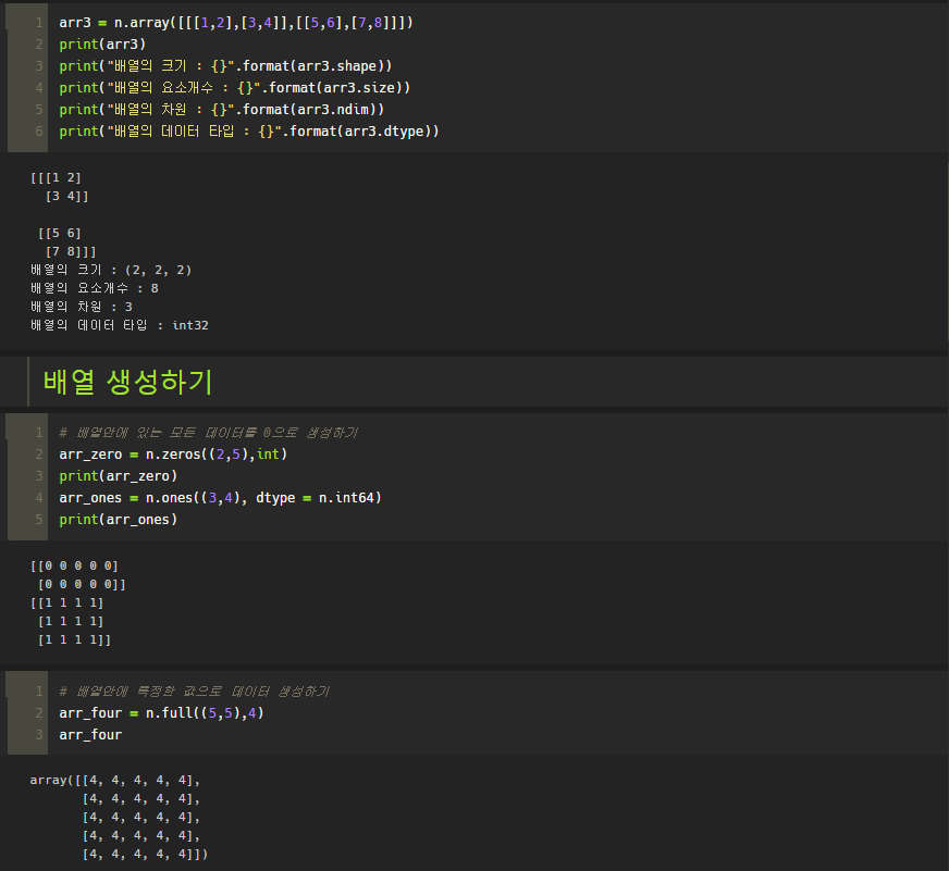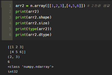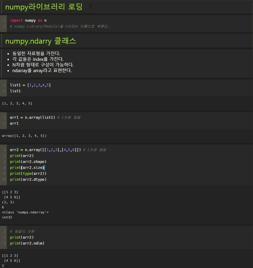 - ndarray를 array라고 표현한다. (표현만 하는게 아니라 실 사용에서도 array로 쓴다.)