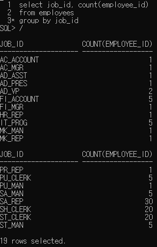 처음에는 COUNT안에 job_id를 집어 넣었는데, 그러면 당연한 말이지만 직업의 수가 나오는 거지 해당 직업의 사원의 수는 나오지 않는다.
