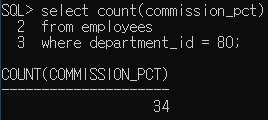 위 그림과 같은 구문을 작성하면 이는, 80번 부서에 근무하는 사원 중 보너스를 받는 사원의 수를 나타낸다.