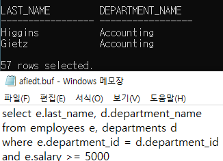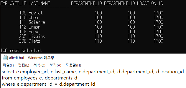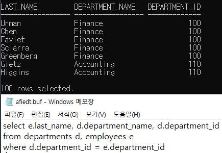 여기서 보면 last_name이나 department_name은 각각 e와 d table의 고유 키이지만따로 호출을 해주었다. 해당 이유는 오라클의 파싱 과정에서 처리 속도를 위한 조치이다.