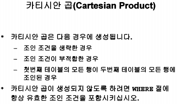 여기서 (n-1)개는 조인 table의 개수를 말한다. -> 조인조건이 생략되거나 잘못작성 시 Cartesian Product라 한다.