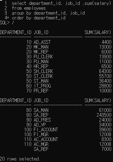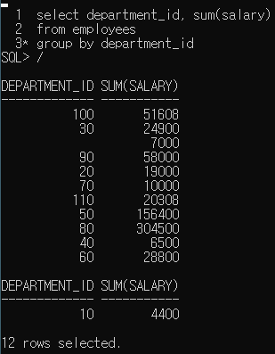 위의 그림과 같이 < department_id >를 그룹화 시켜주면, 부서번호 별로 그룹화가 되어 각 그룹별 Salary의 합계를 나타내는 것. 또 다른 예로