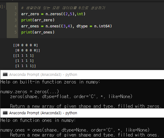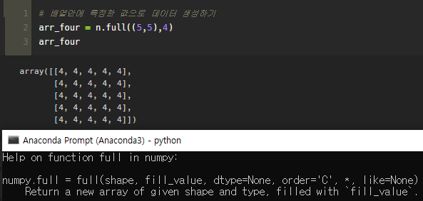 ones, zeros는 의미 그대로이고, full은 내가 원하는 값으로 배열을 생성할 수 있다.