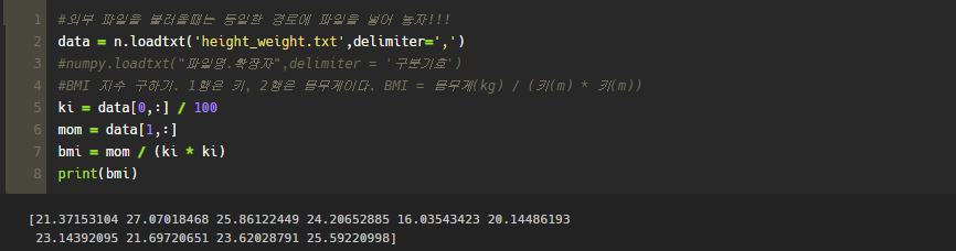 numpy Library를 통해 txt파일을 불러오는 명령어이다. 불러올때에 "delimiter"라는 요소를 통해 구분자를 지어 array 형태로 데이터를 저장할 수 있다.