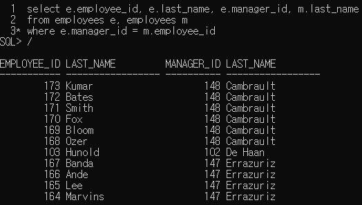 위의 사진을 보면 결국 manager도 사원이다. 때문에 사원을 관리하는 manager 번호는 e table에서 꺼내지만 해당 사원을 관리하는 manager 이름을 호출하기 위해 결국 manager 번호가 employees번호와 일치하는 이름을 manager 이름으로 호출해야하기 때문에 위와 같은 구문을 사용하는 것.
