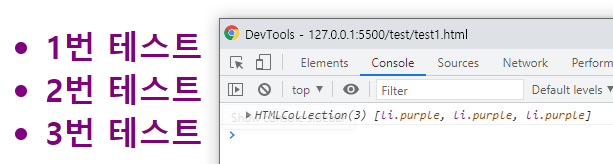 Console창에 보면, 위에 설명했듯이 HTMLCollection으로 반환됨을 확인할 수 있다. 여기서